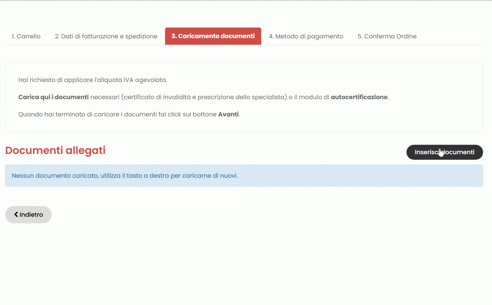 - 3. Proseguire nel check-out inserendo i dati di fatturazione e spedizione. Nel terzo passaggio Caricamento documenti, ti verrà chiesto di caricare i documenti necessari (certificato L. 104 e prescrizione del medico specialista del SSN). Puoi anche, come indicato, scaricare e compilare l'autocertificazione in sostituzione di entrambi.
