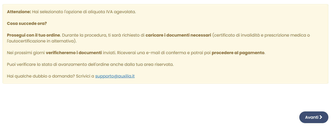 Ti apparirà sulla schermata un box che riepiloga tutti i passaggi per ottenere l'IVA agevolata. Leggilo con attenzione e poi clicca su Avanti per proseguire nel check-out