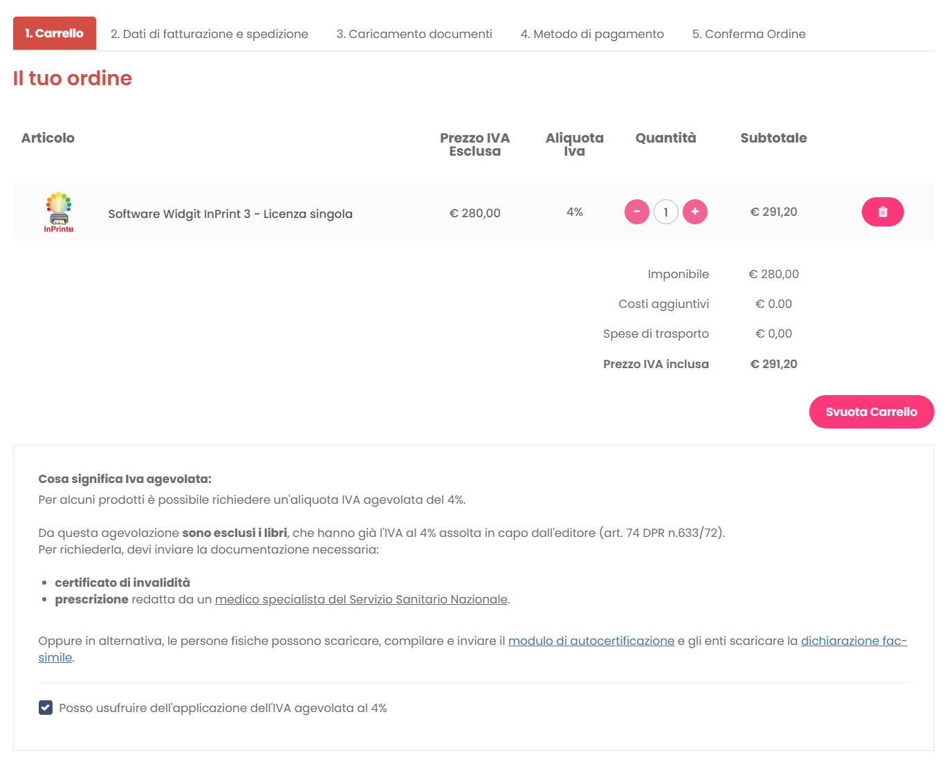 - 2. Nella prima schermata del Carrello spunta la casella Posso usufruire dell'applicazione dell'IVA agevolata al 4% e clicca poi su Avanti.